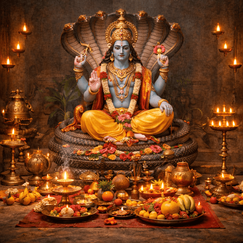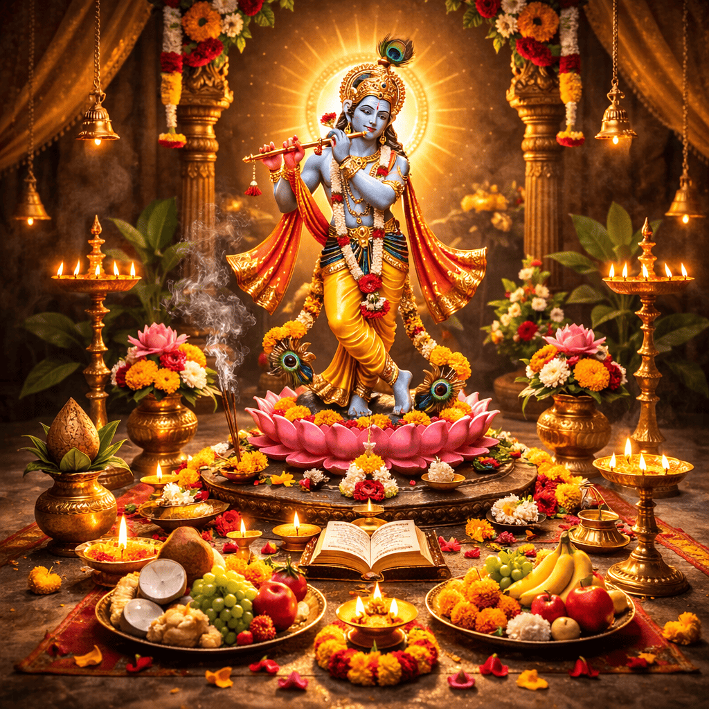 पीला कपड़ा, रोली (कुमकुम), अक्षत (चावल), चंदन, फूल और माला, तुलसी के पत्ते, अगरबत्ती, धूप, घी का दीपक, कपूर, माखन, मिश्री, पंचामृत (दूध, दही, घी, शहद, शक्कर), फल, मिठाई, पान के पत्ते, सुपारी, नारियल, लौंग, इलायची