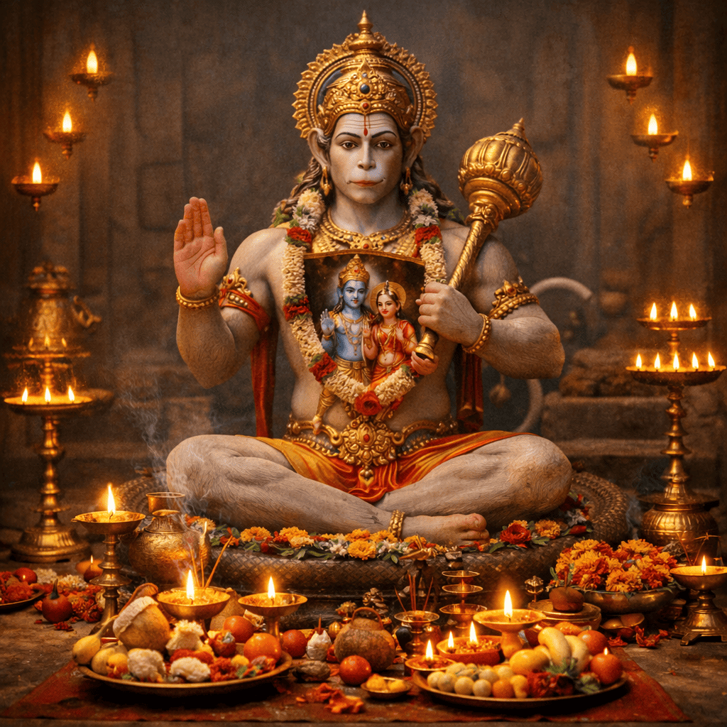 लाल कपड़ा, रोली (कुमकुम), अक्षत (चावल), चंदन, सिंदूर, चमेली का तेल, लाल फूल, तुलसी पत्ते, अगरबत्ती, धूप, घी का दीपक, कपूर, पान के पत्ते, सुपारी, नारियल, फल, मिठाई (लड्डू या बूंदी), लौंग, इलायची, और मौली (कलावा)